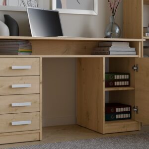 Wyposażone w 4 szuflady oraz zamykany 1 drzwiami schowek z 2 półkami, zapewnia dużo miejsca do przechowywania dokumentów, książek czy akcesoriów biurowych. Dodatkowa otwarta półka pod blatem idealnie sprawdzi się na drobne przedmioty, laptopa czy zeszyty.