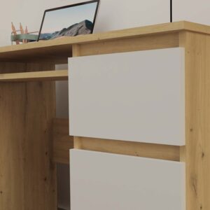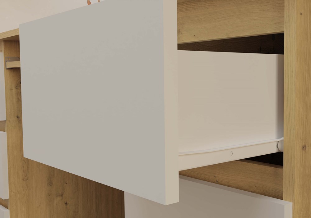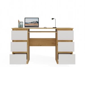 Dzięki szerokiemu blatowi oraz licznych szufladom zyskujesz funkcjonalną przestrzeń do przechowywania i pracy.