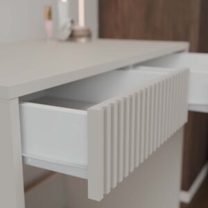 - Ryflowane fronty szuflad – pionowe ułożenie lameli to detal, który podkreśla nowoczesny charakter mebla i dodaje mu wyjątkowego szyku.