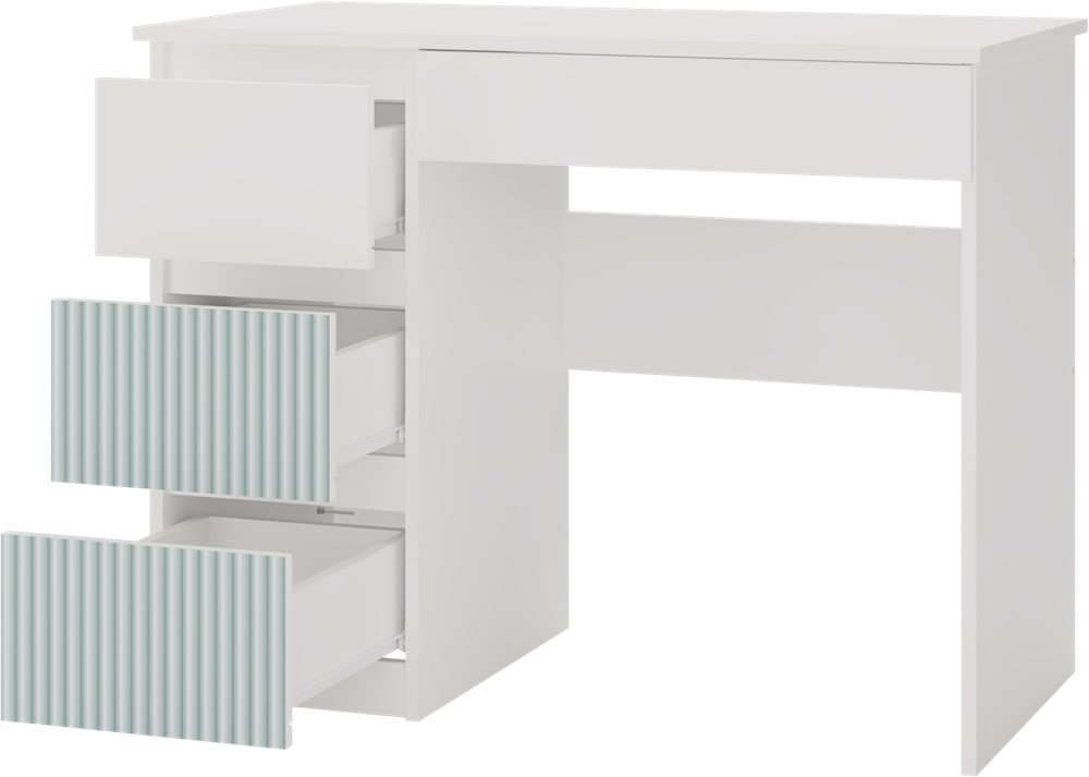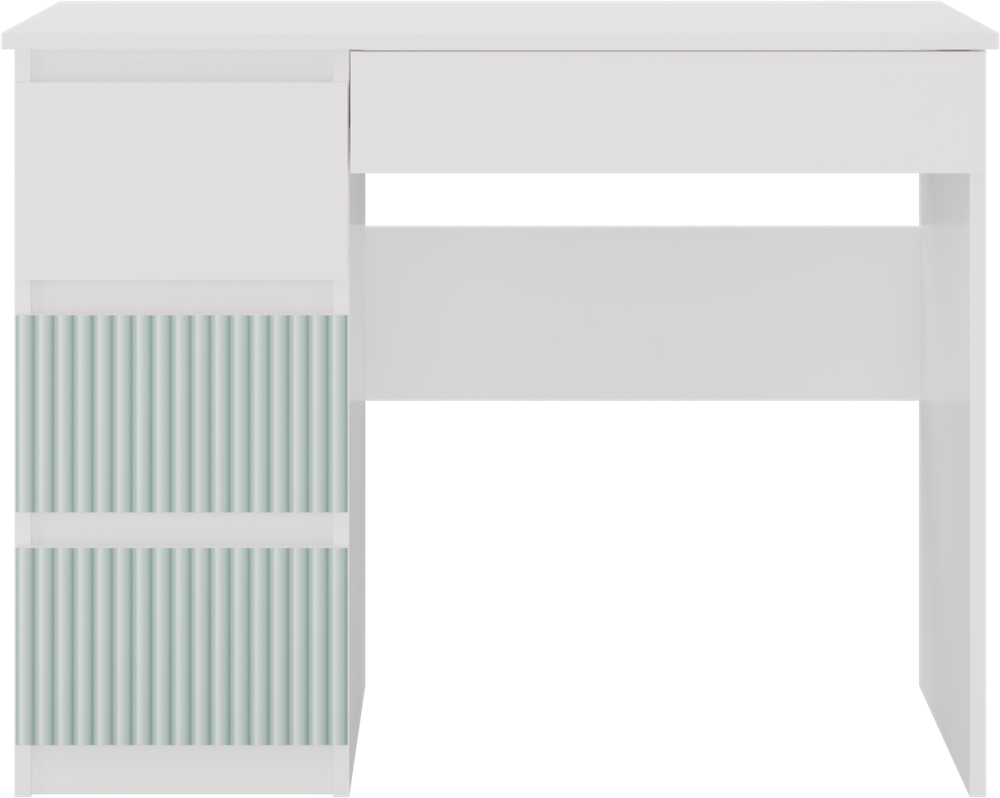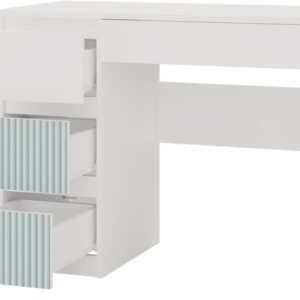 - 3 pojemne wysokie szuflady z lewej strony (w tym 2 szuflady ze wzorami w kolorze miętowym) i 1 niska z prawej strony pod blatem