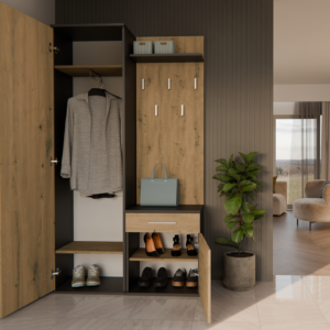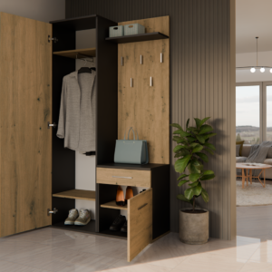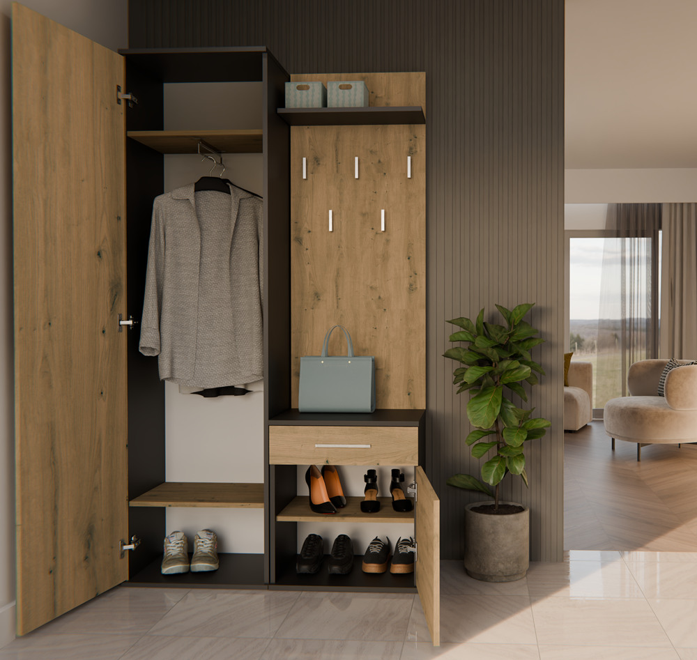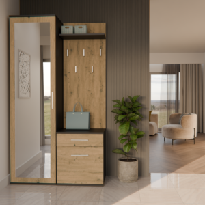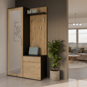 - Szafę z lustrem, szafkę oraz wieszak można zamontować blisko siebie, jak i zarówno rozsunąć.