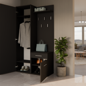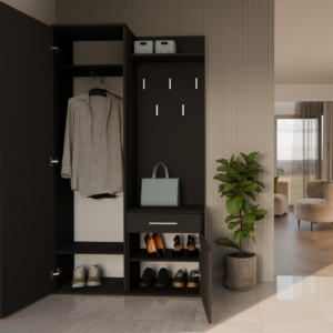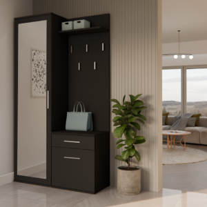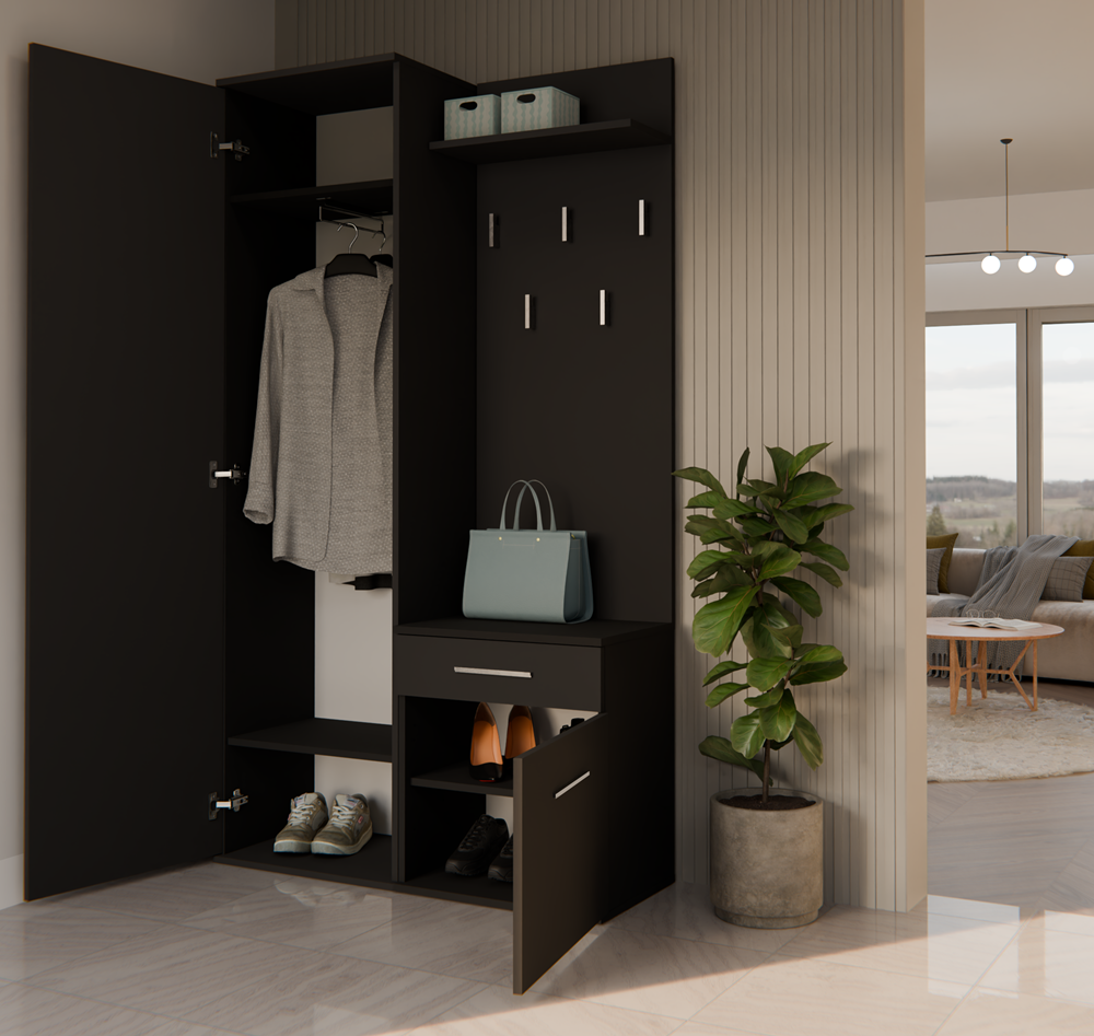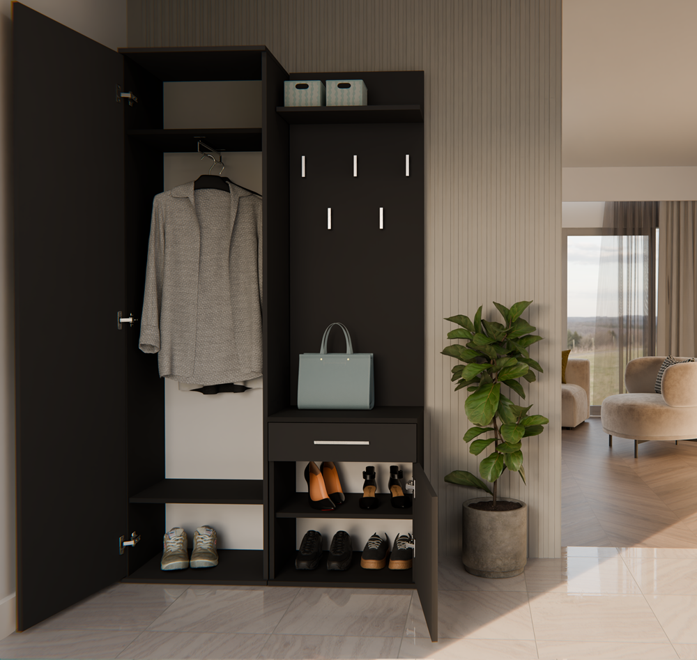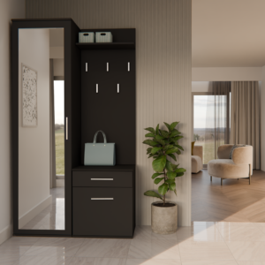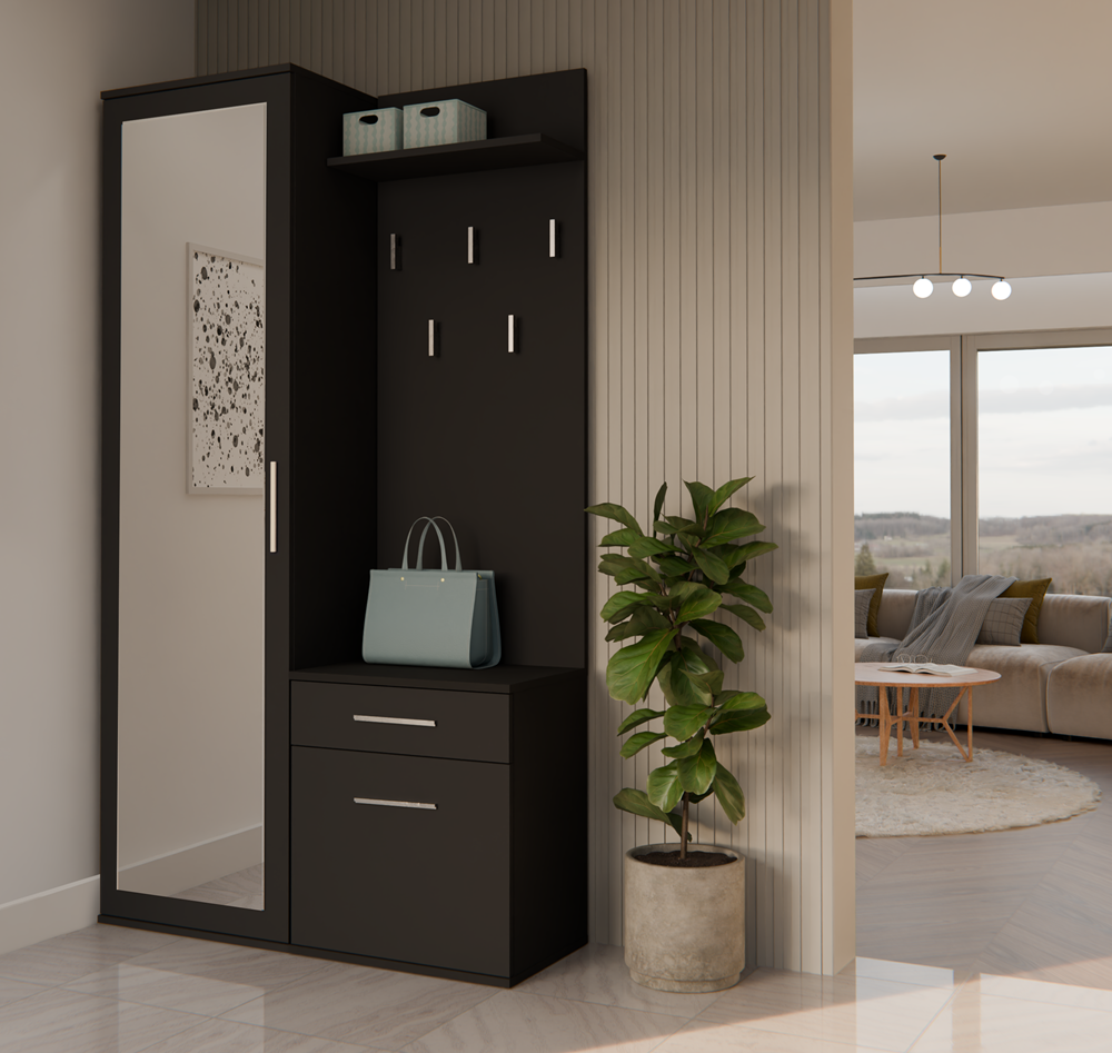 - Szafę z lustrem, szafkę oraz wieszak można zamontować blisko siebie, jak i zarówno rozsunąć.