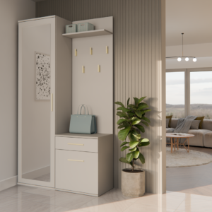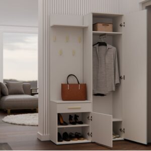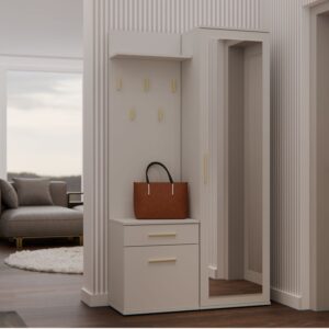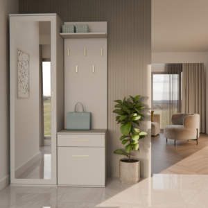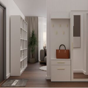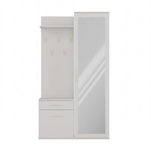 - Szafę z lustrem, szafkę oraz wieszak można zamontować blisko siebie, jak i zarówno rozsunąć.