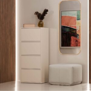 Komoda ALMA to elegancki i funkcjonalny mebel, który świetnie sprawdzi się w różnych pomieszczeniach — od przedpokoju, przez salon i sypialnię, aż po pokój dziecka czy domowe biuro. Jej minimalistyczna forma i klasyczny biały kolor pasują do wielu stylów wnętrzarskich, a bezuchwytowe fronty z systemem TIP-ON dodają nowoczesnego charakteru.
