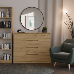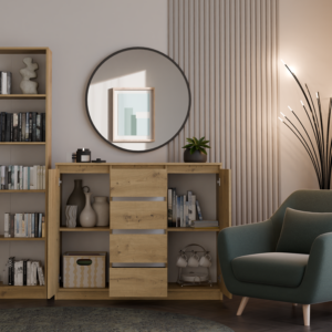 - Bezuchwytowe, fronty szuflad oraz drzwi zapewniają wygodne użytkowanie i podkreślą modernistyczny charakter wnętrza