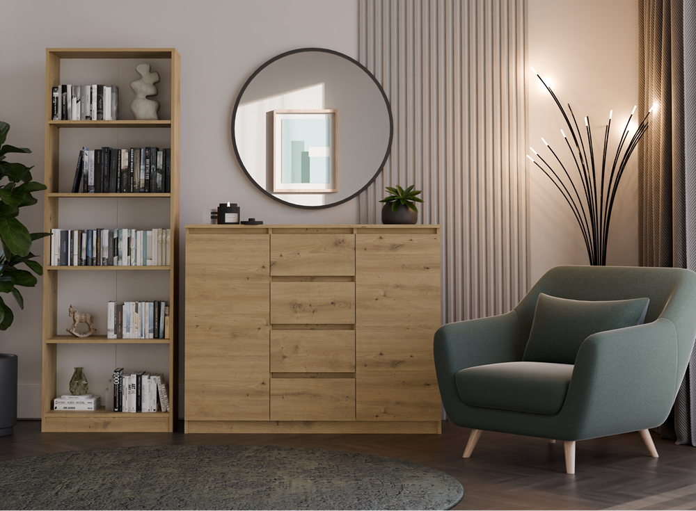 Dokładamy wszelkich starań, aby kolory mebli prezentowane na zdjęciach były odwzorowane możliwie jak najdokładniej. Należy jednak pamiętać, że ich odbiór może się różnić w zależności od indywidualnych ustawień monitora lub ekranu (takich jak jasność, kontrast, temperatura barwowa czy technologia wyświetlania). Rzeczywisty odcień produktu może się także różnić w zależności od warunków oświetleniowych.