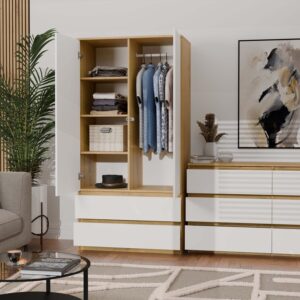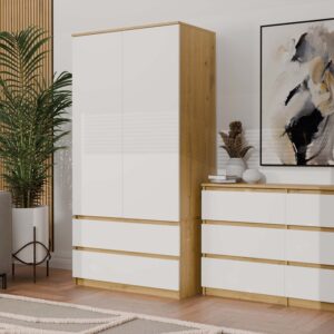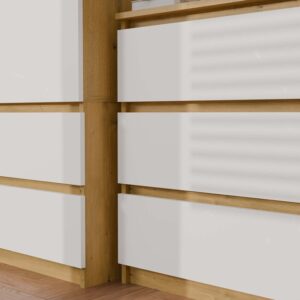 - Modna kolorystyka – ciepły odcień drewna Dąb Artisan z białymi frontami rozjaśni wnętrze i doda lekkości
