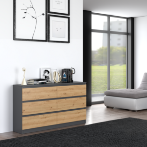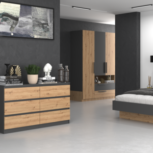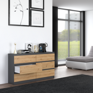 - Bezuchwytowe fronty szuflad zapewniają wygodne użytkowanie i podkreślą modernistyczny charakter wnętrza