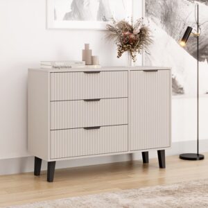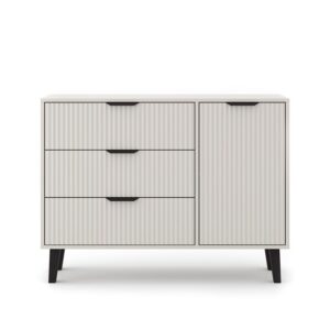 Fronty drzwi i szuflad ozdobione zostały eleganckim ryflowaniem, które nadaje meblowi charakterystyczny wygląd inspirowany lamelami. Całość dopełniają czarne uchwyty i wysokie, czarne nóżki nadające meblowi lekkości i wyjątkowego stylu.