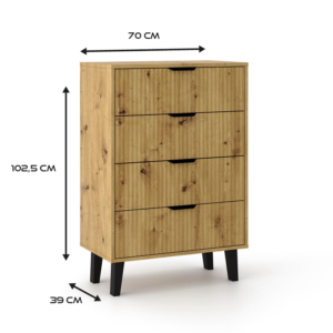 Dzięki czterem pojemnym szufladom z łatwością pomieścisz odzież, akcesoria, dokumenty czy inne drobiazgi, zachowując porządek i estetykę w sypialni, przedpokoju, salonie lub pokoju młodzieżowym. To kompaktowy, a zarazem pojemny mebel, który odnajdzie się zarówno w mniejszych, jak i większych przestrzeniach.