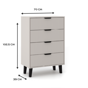 Dzięki czterem pojemnym szufladom z łatwością pomieścisz odzież, akcesoria, dokumenty czy inne drobiazgi, zachowując porządek i estetykę w sypialni, przedpokoju, salonie lub pokoju młodzieżowym. To kompaktowy, a zarazem pojemny mebel, który odnajdzie się zarówno w mniejszych, jak i większych przestrzeniach.