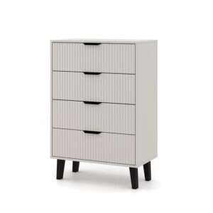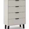 Komoda SCANDI 4S SLIM to idealna propozycja dla tych, którzy szukają praktycznego mebla do przechowywania z nutą nowoczesnego designu. Modny kolor KASZMIR w połączeniu z ryflowanymi frontami i wysokimi czarnymi nóżkami nadaje wnętrzu przytulności, a jednocześnie elegancji.