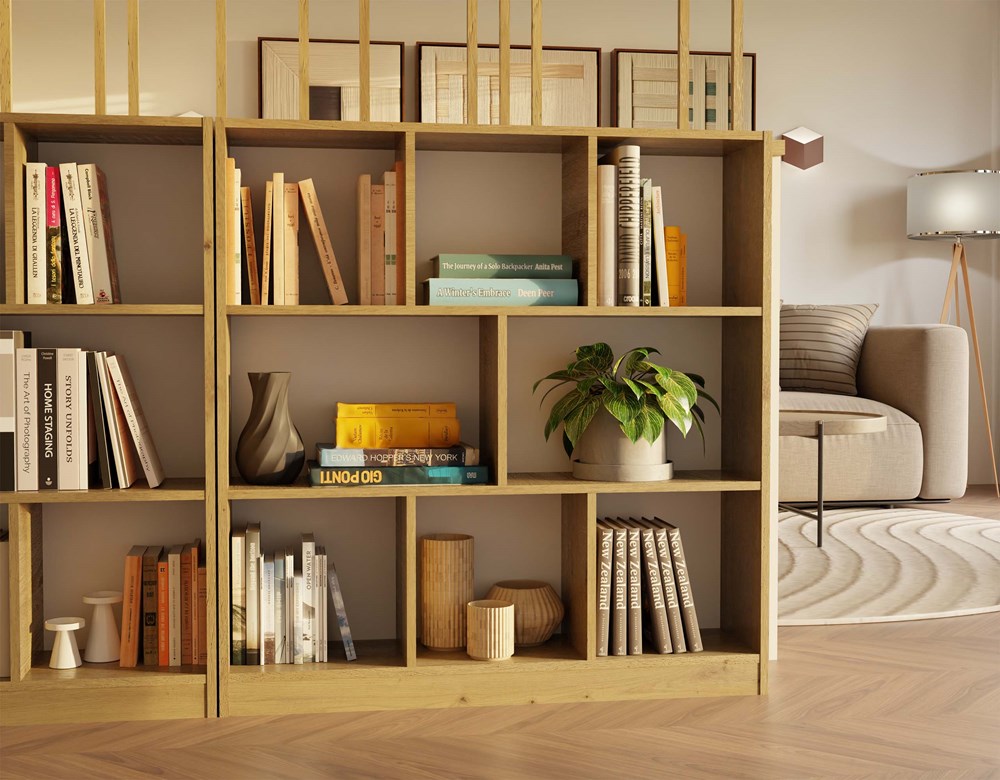 Posiada 8 pojemnych przegród, które pomogą w organizacji przestrzeni i umożliwią estetyczne wyeksponowanie ulubionych przedmiotów. Naturalny kolor dąb artisan – ciepłe, eleganckie wykończenie pasujące do wielu stylów wnętrz.