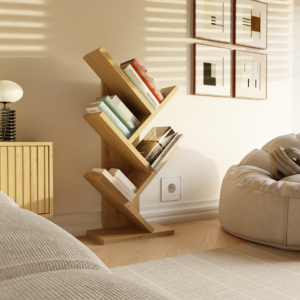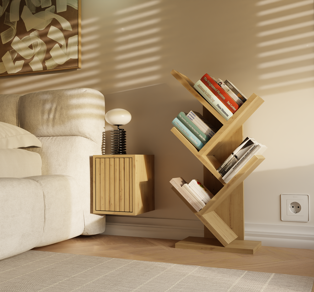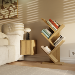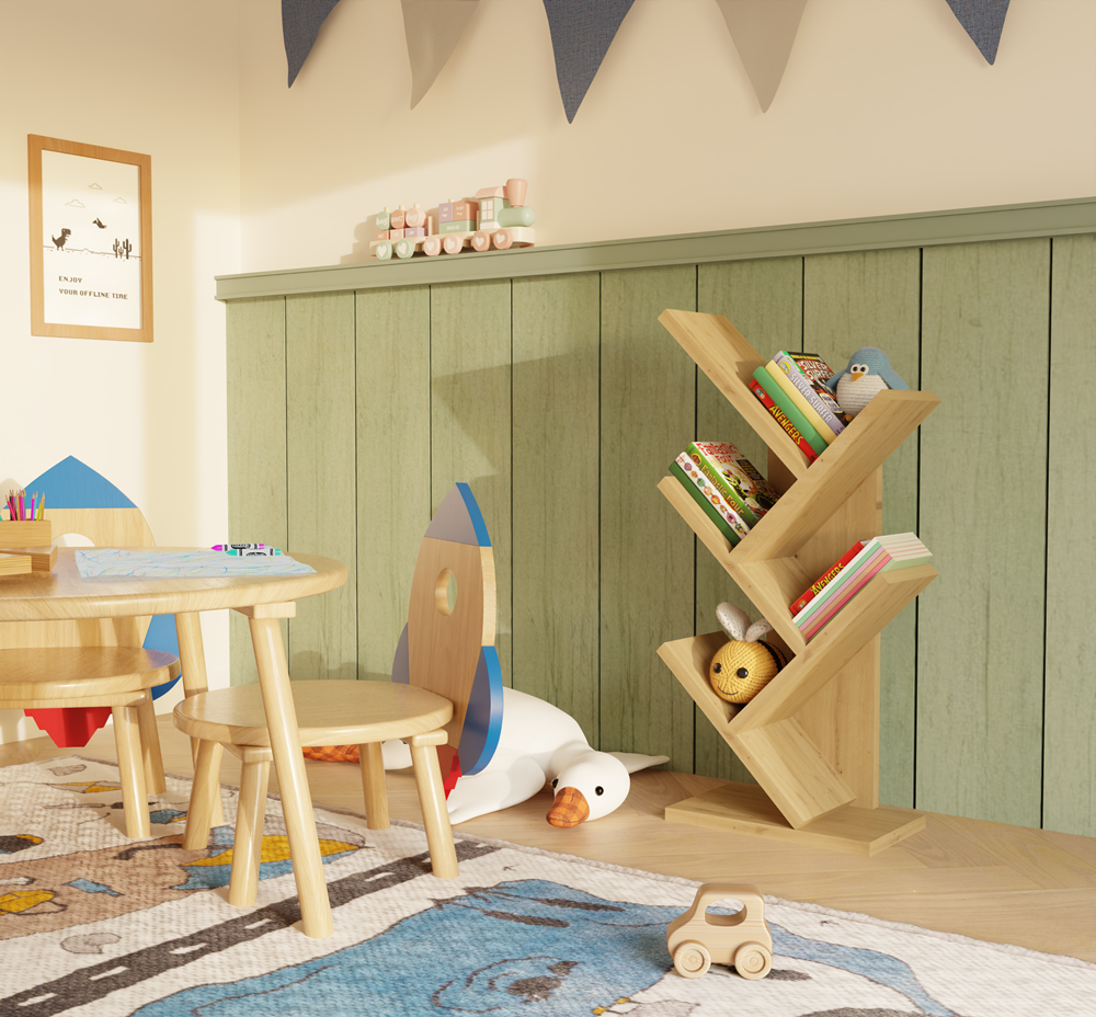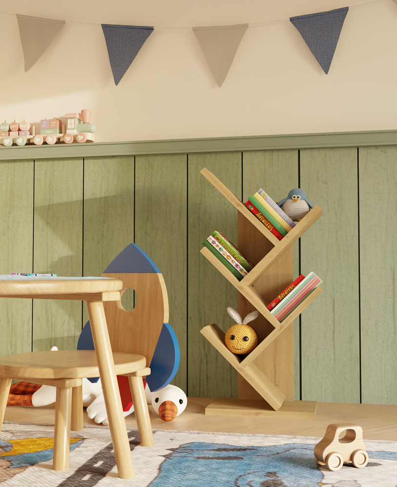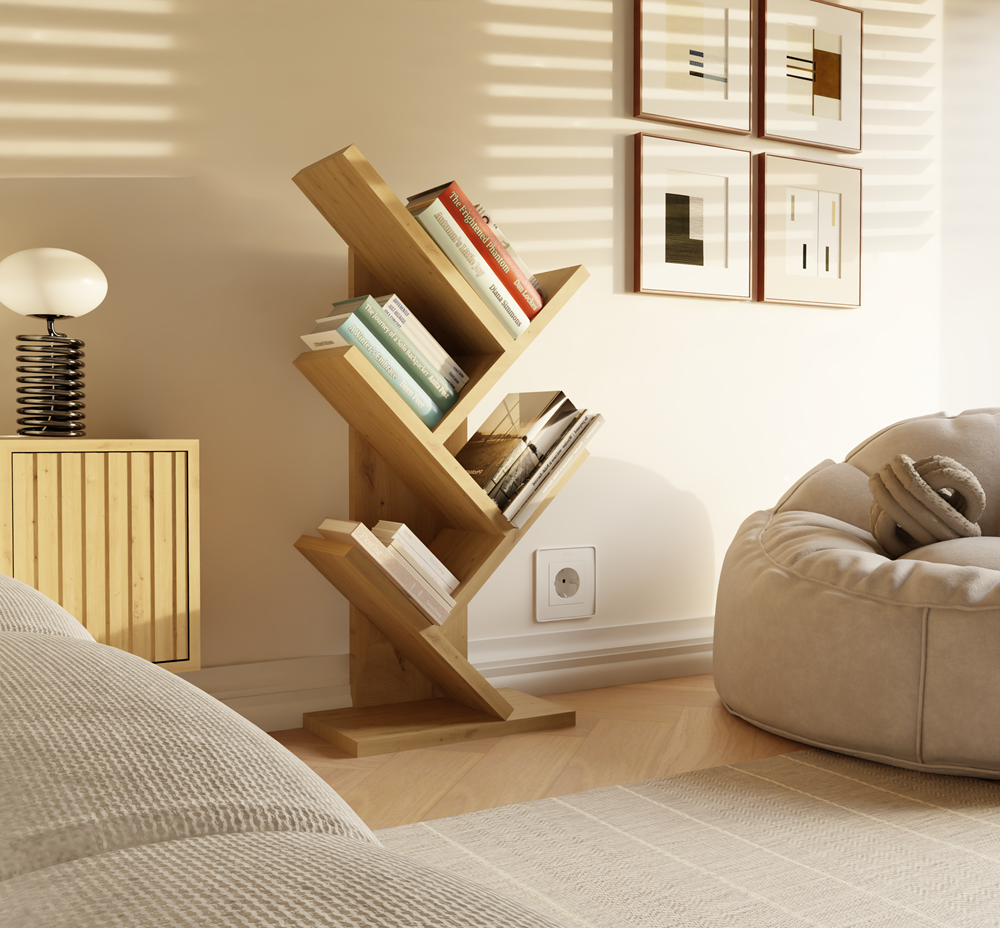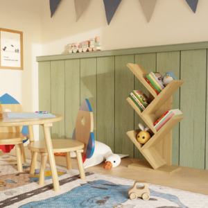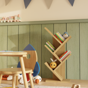 - 4 skośne otwarte półki – idealne na książki, segregatory, ozdoby czy zabawki