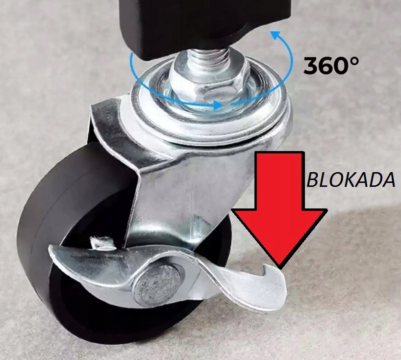 Regał posiada 4 kółka obracające się o 360 stopni, a dodatkowo 2 z nich posiadają specjalną blokadę, która uniemożliwia samowolne przesunięcie regału.