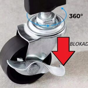 Regał posiada 4 kółka obracające się o 360 stopni, a dodatkowo 2 z nich posiadają specjalną blokadę, która uniemożliwia samowolne przesunięcie regału.