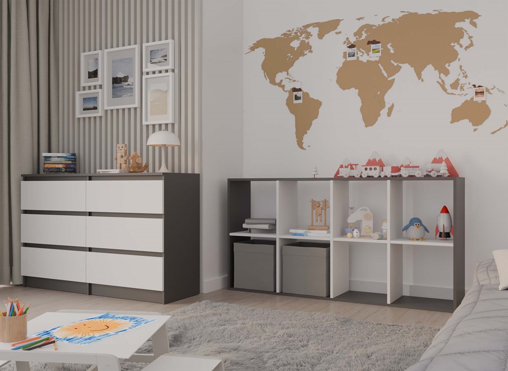 - Uniwersalność: Otwarty regał komorowy, który doskonale sprawdzi się jako miejsce na książki, zabawki, dokumenty oraz inne przedmioty.