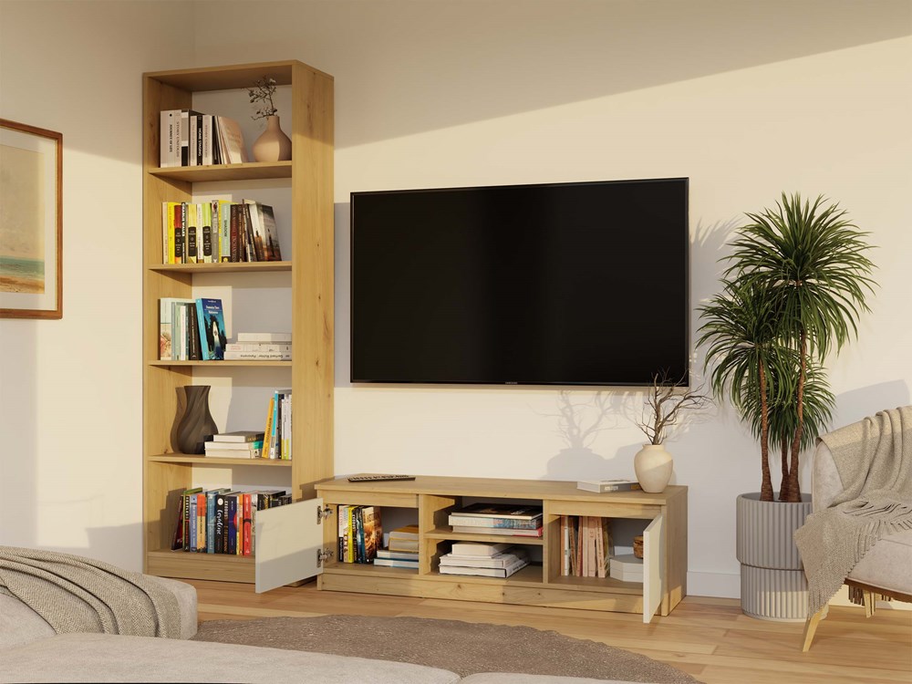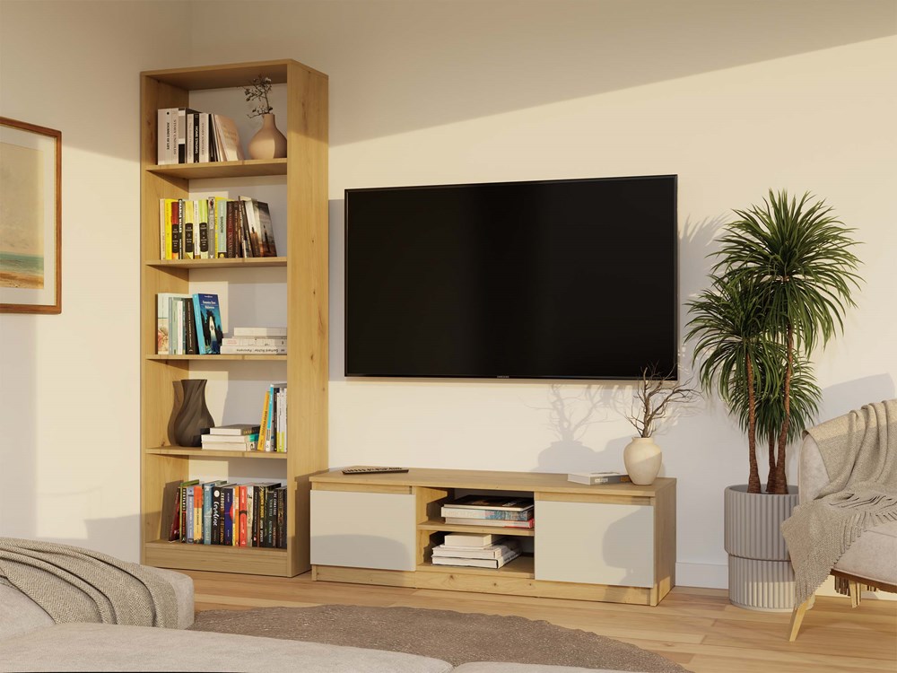 - Praktyczna otwarta półka – doskonała na sprzęt RTV, z tylnym otworem ułatwiającym organizację kabli.