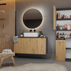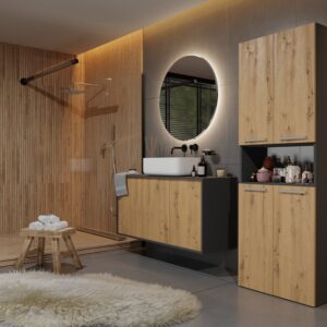 - Szafka posiada 5 praktycznych (4 zamykane, 1 otwarta) półek oraz kosz