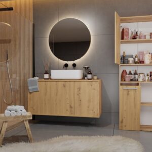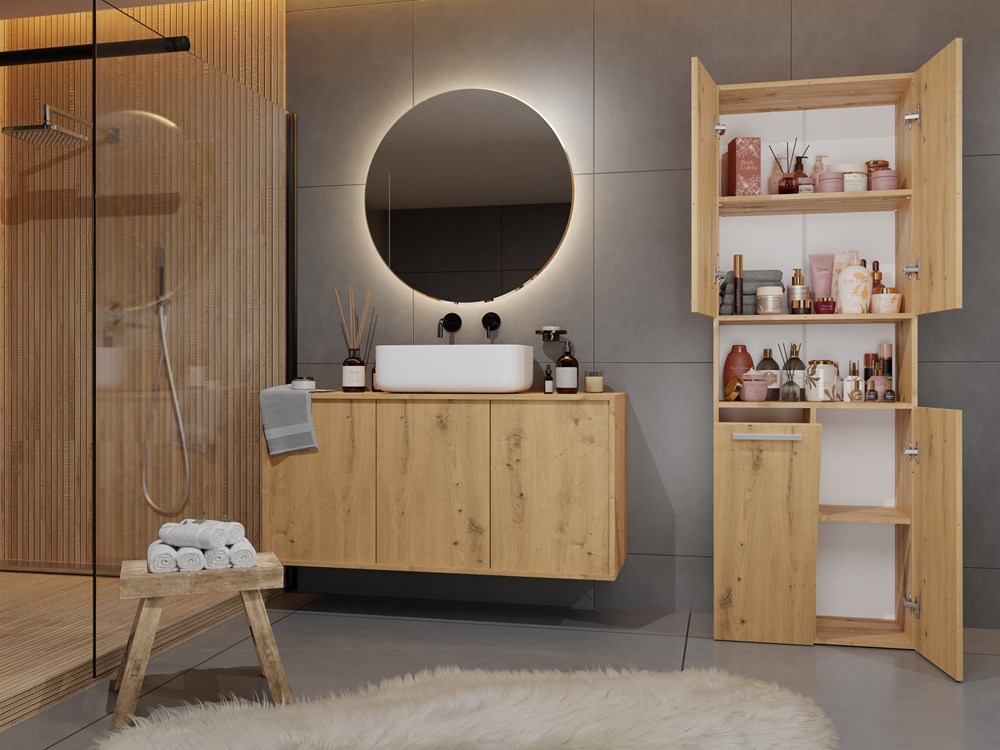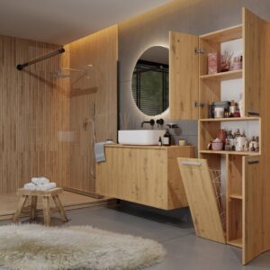 - Szafka posiada 5 praktycznych (4 zamykane, 1 otwarta) półek oraz kosz