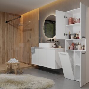 - Szafka posiada 5 praktycznych (4 zamykane, 1 otwarta) półek oraz kosz