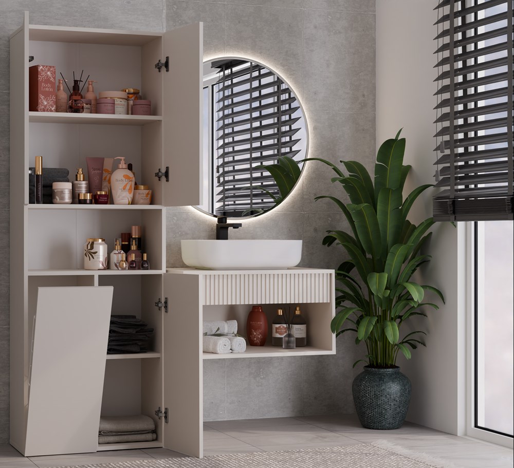 - Szafka wyposażona w 4 zamykane i 1 otwartą półkę oraz praktyczny kosz, idealny na przechowywanie bielizny lub ręczników.