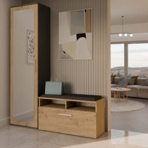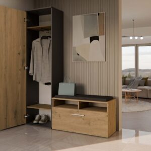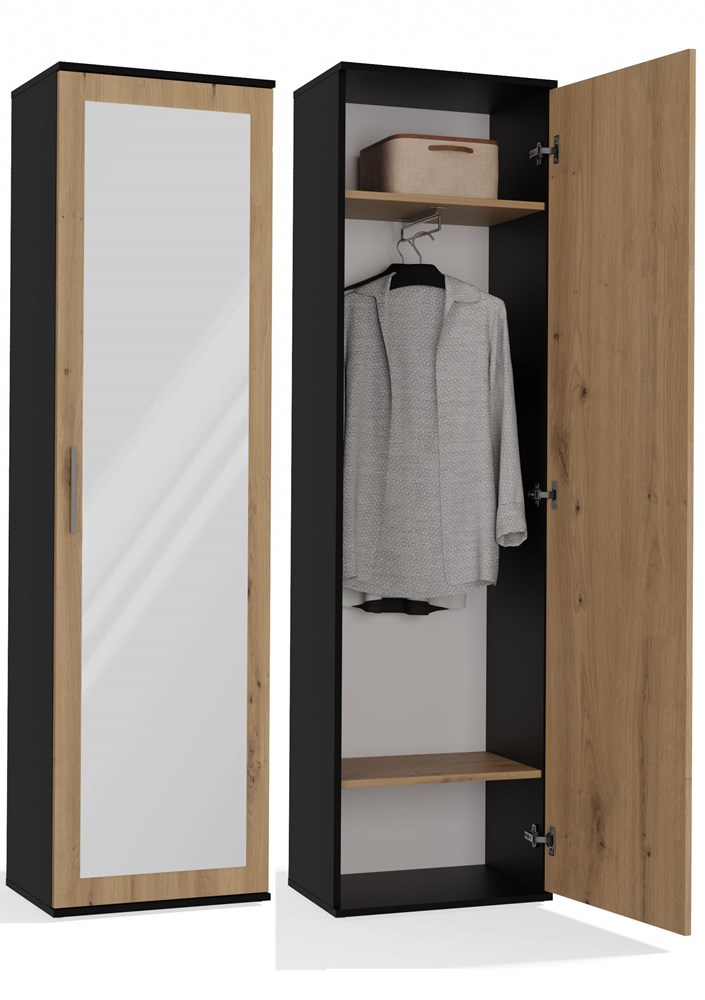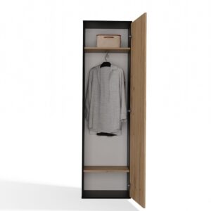 - W środku szafy dwie praktyczne półki oraz uchwyt na wieszaki.