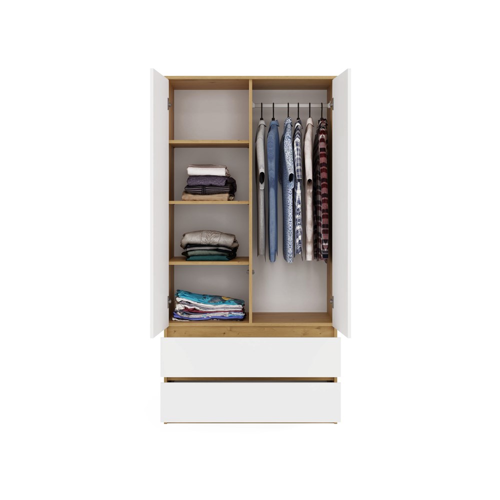 Szafa MALWA SS-90 to nowoczesny mebel, który łączy elegancję z praktycznym podejściem do przechowywania. Dzięki przemyślanej konstrukcji z licznymi półkami, drążkiem na ubrania i dwiema pojemnymi szufladami doskonale sprawdzi się w sypialni, garderobie, pokoju młodzieżowym czy domowym biurze.