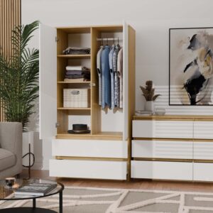 - Funkcjonalna przestrzeń: półki, drążek i szuflady zapewniają wszechstronne przechowywanie