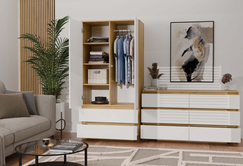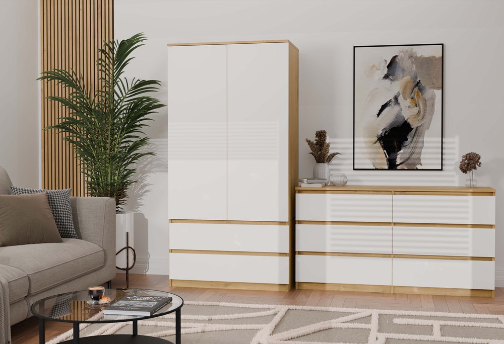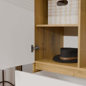 Połączenie ciepłego odcienia dębu artisan z białymi, gładkimi frontami nadaje meblowi lekkości i wpisuje się w najnowsze trendy wnętrzarskie.