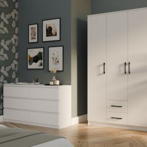 Szafa ROMANA 120 to doskonałe połączenie estetyki, funkcjonalności i kompaktowej formy. Dzięki przemyślanemu układowi wewnętrznemu zapewnia wygodną organizację garderoby, a jej uniwersalny biały kolor sprawia, że z łatwością dopasuje się zarówno do sypialni, jak i pokoju młodzieżowego, biura czy przedpokoju.