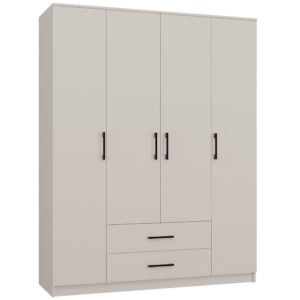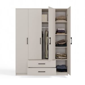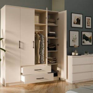 - Duża pojemność: Przestronny układ wewnętrzny z półkami oraz drążkiem na ubrania sprawia, że szafa idealnie nadaje się do przechowywania zarówno odzieży wiszącej, jak i składanej. Dodatkowo, dwie szuflady pozwalają na wygodne przechowywanie bielizny czy akcesoriów.