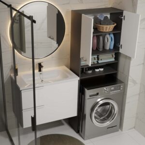 Szafka łazienkowa Pola DK to funkcjonalny i nowoczesny regał, który pozwala maksymalnie wykorzystać przestrzeń nad pralką. Jest to idealne rozwiązanie dla osób, które chcą uporządkować łazienkę i zyskać dodatkowe miejsce do przechowywania bez zajmowania cennej powierzchni podłogi.