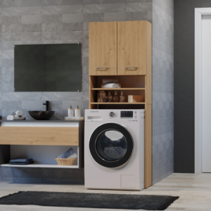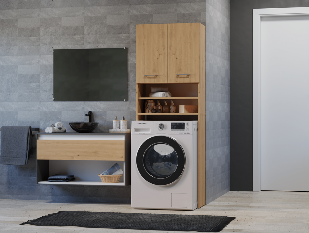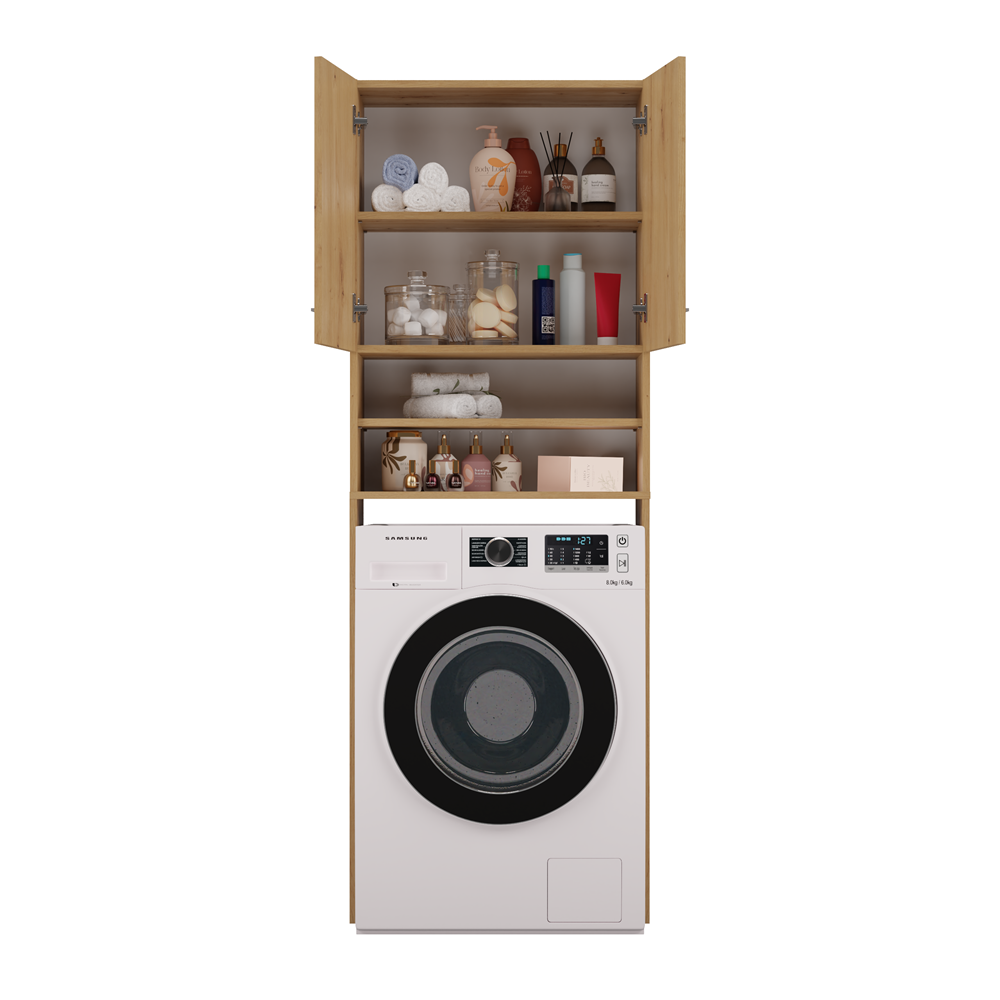 - Szafka posiada 2 półki schowane za drzwiczkami oraz 2 półki odsłonięte