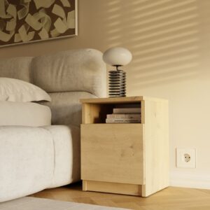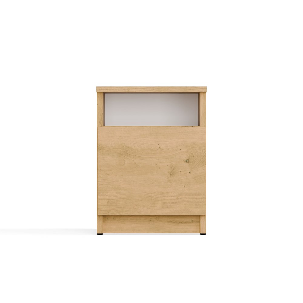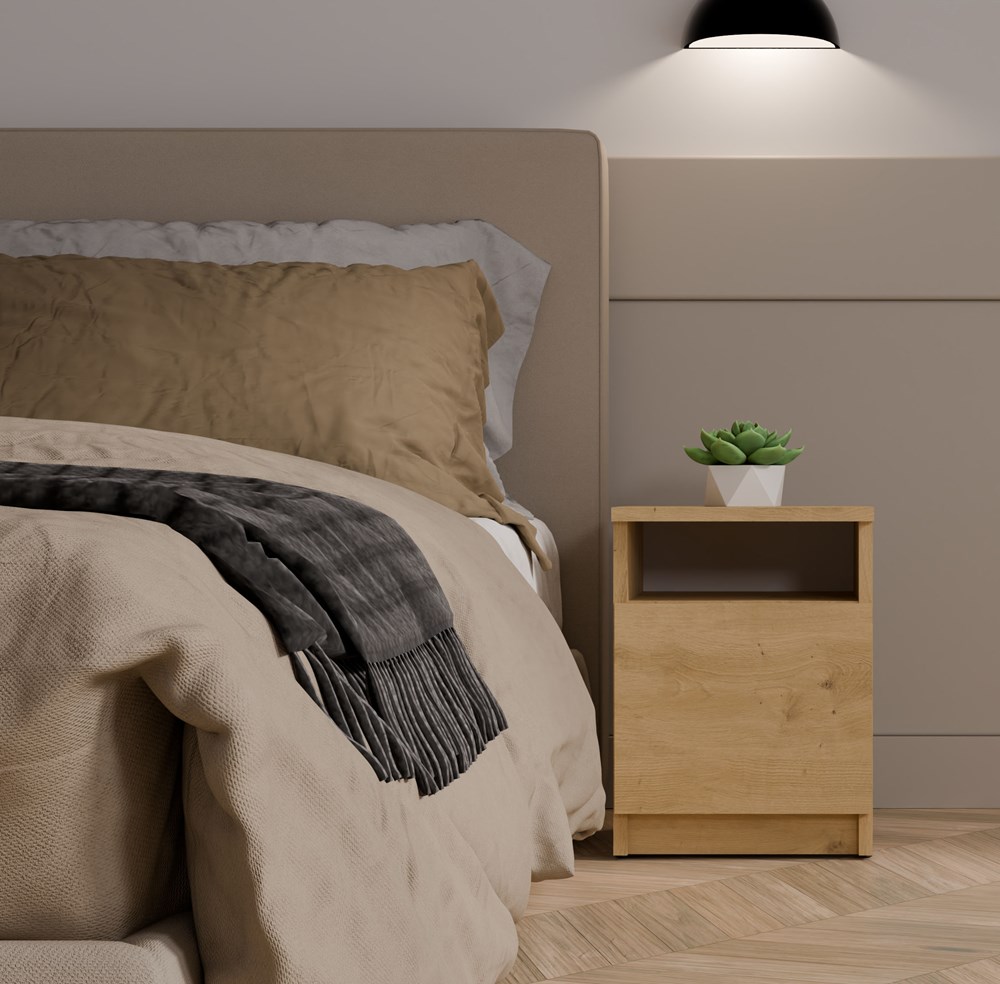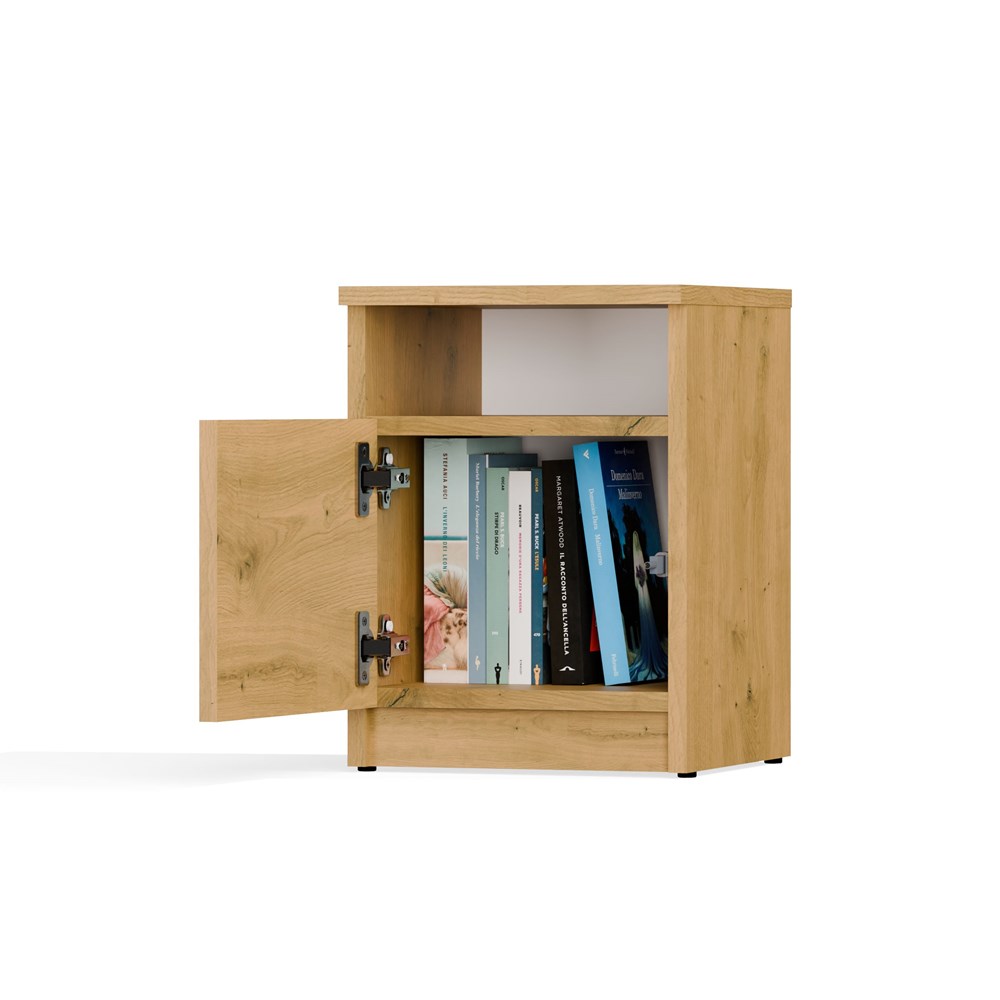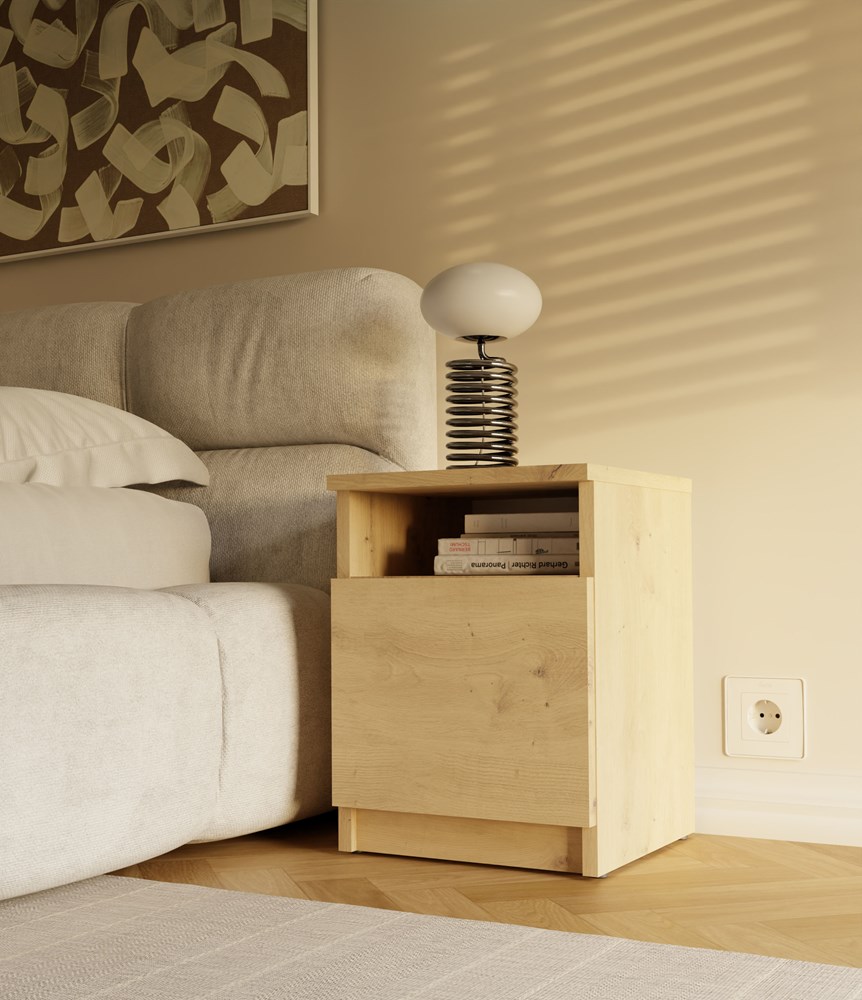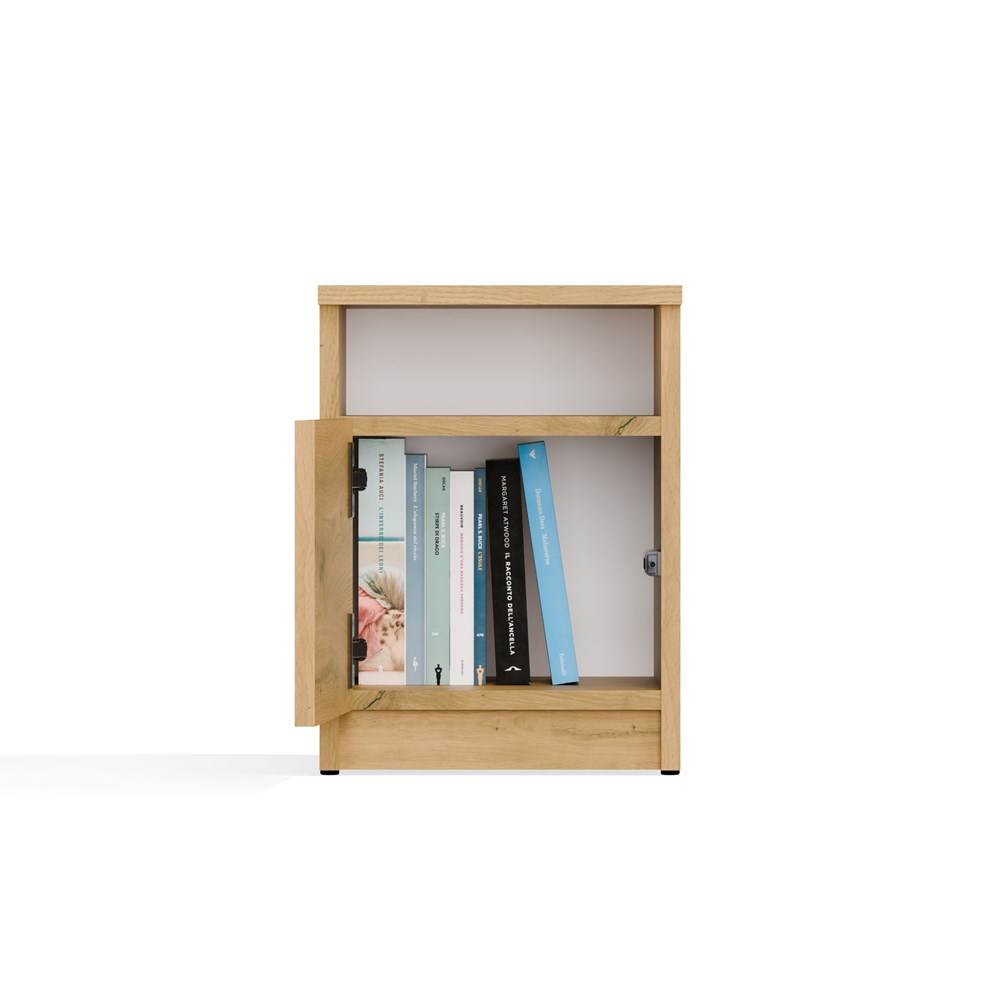 - Półka otwarta oraz zamknięta za drzwiami: idealne do przechowywania najpotrzebniejszych rzeczy, takich jak telefon, ładowarka, książka czy okulary.