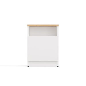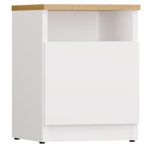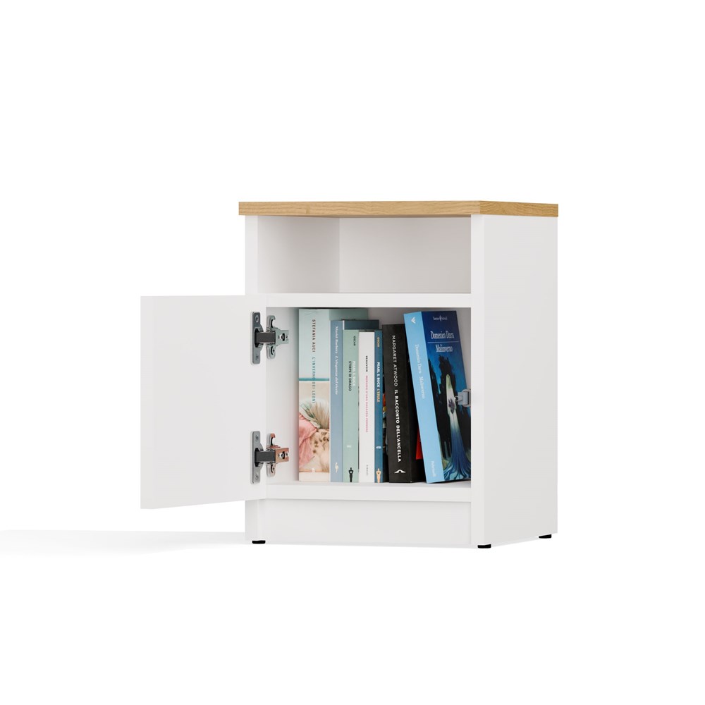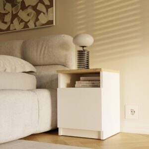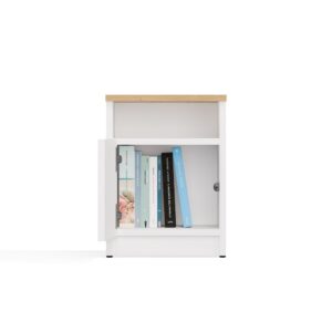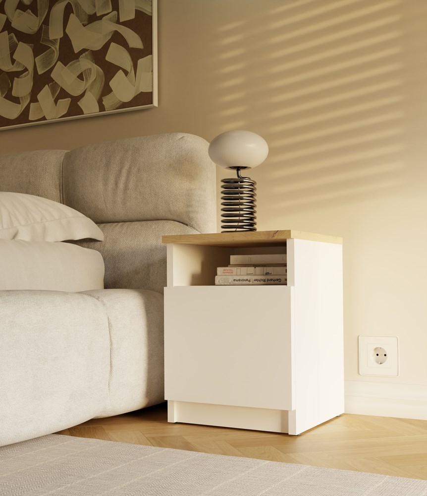 - Półka otwarta oraz zamknięta za drzwiami: idealne do przechowywania najpotrzebniejszych rzeczy, takich jak telefon, ładowarka, książka czy okulary.