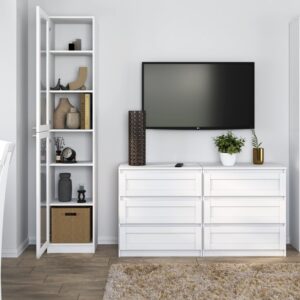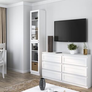 Za przeszklonymi drzwiami znajduje się 6 przestronnych półek, które umożliwiają efektywne zorganizowanie i uporządkowanie różnych przedmiotów – od książek i dokumentów po dekoracje.